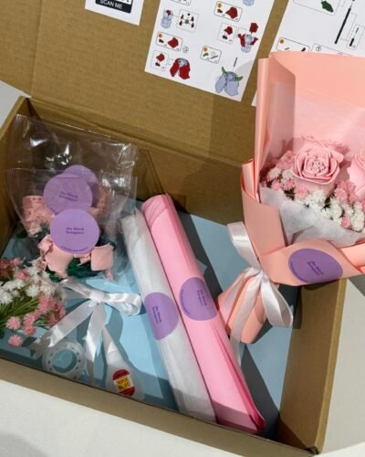 The flowers you see are already built and wrapped for you. However, if you prefer to build them yourself, we offer a DIY version where everything you need—including glue, tape, and wrapping paper—is provided in a kit.